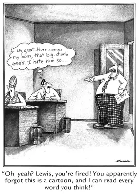 Larsonas dažnai patenkino skaitytoją ir ne tik jį atskyrė, bet ir buvo tik kelios juostelės. Vyras pradeda galvoti apie jo viršininko skambučius, nes jis gali priartėti prie savo viršininko ir skaityti jo mintis kaip animacinį filmą. Tai puikus meteksas, tačiau jis yra pakankamai pasirengęs, kad skaitytojai galėtų pradėti atspėti jų realybę. Jei šis viršininkas gali perskaityti darbuotojo idėjas, kurios pasakytų, kad negalima perskaityti jokios kitos idėjos? Manau, kad tai beprotiška Ta bort sidan .
