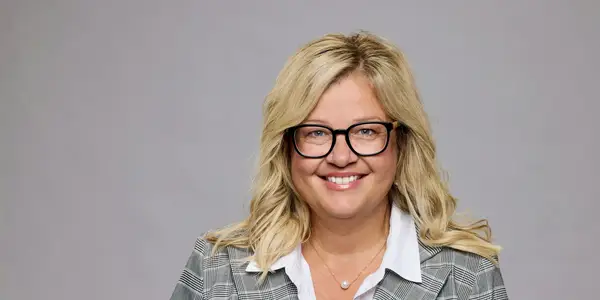 Angela Murray från säsongen av Big Brother på Gray Blazer leende